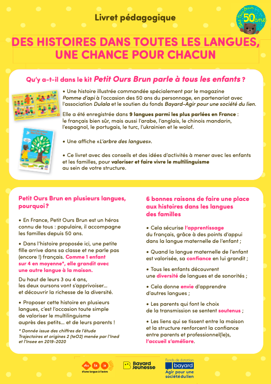Parce que Petit Ours Brun est un héros populaire – au sens le plus noble du terme. Il accompagne depuis des décennies un très grand nombre de familles en France, qu’elles parlent le français ou d’autres langues à la maison. À travers ce personnage familier, Dulala a souhaité porter le multilinguisme au cœur du quotidien de toutes les familles, y compris celles qui ont peu accès aux livres, en s’appuyant sur un personnage déjà bien présent dans les foyers, les crèches, les écoles maternelles et les PMI.